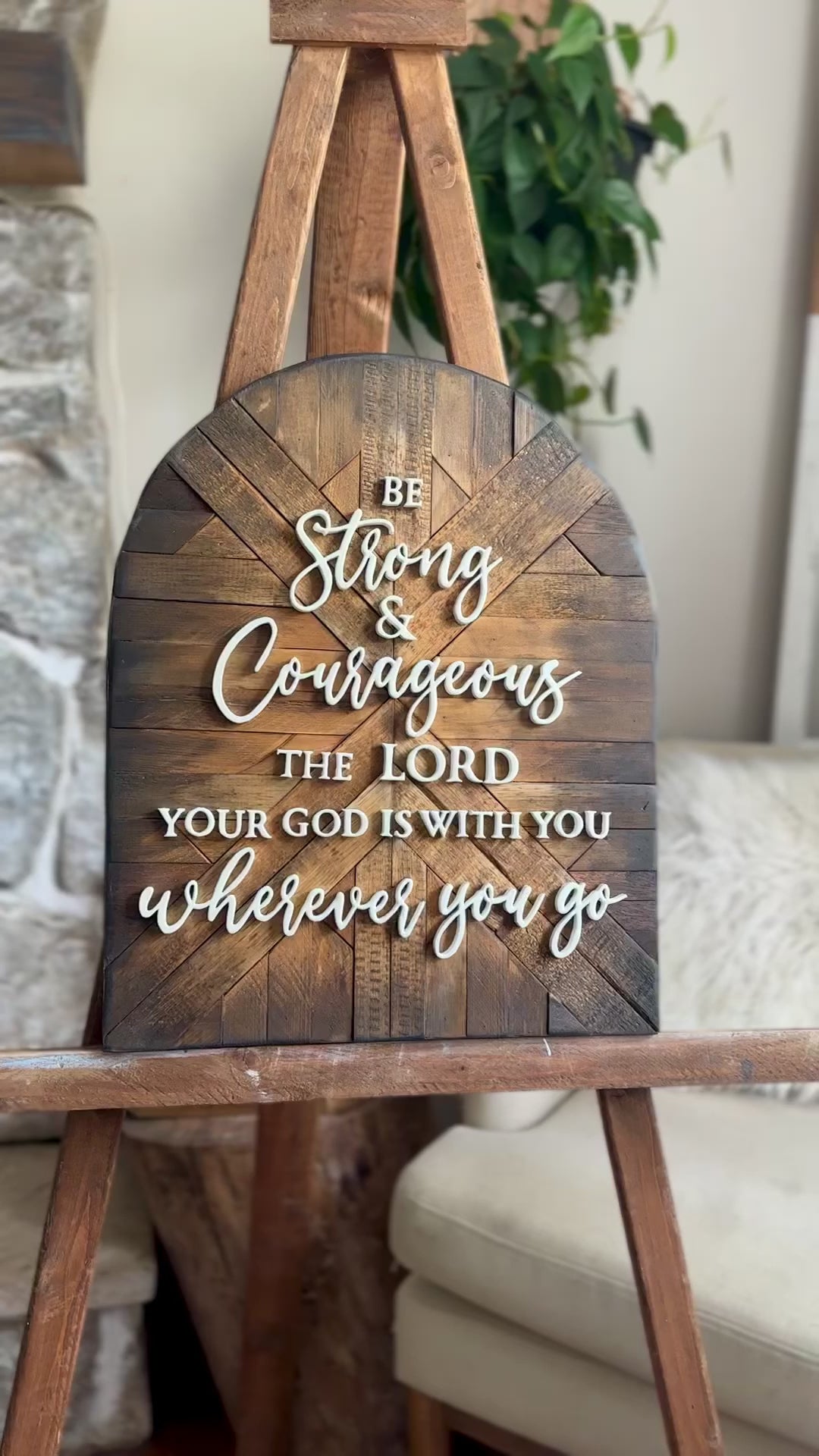 This one-of-a-kind, arch-shaped mosaic backer is handcrafted entirely from reclaimed wood and features Joshua 1:9 in elegant, raised white lettering: