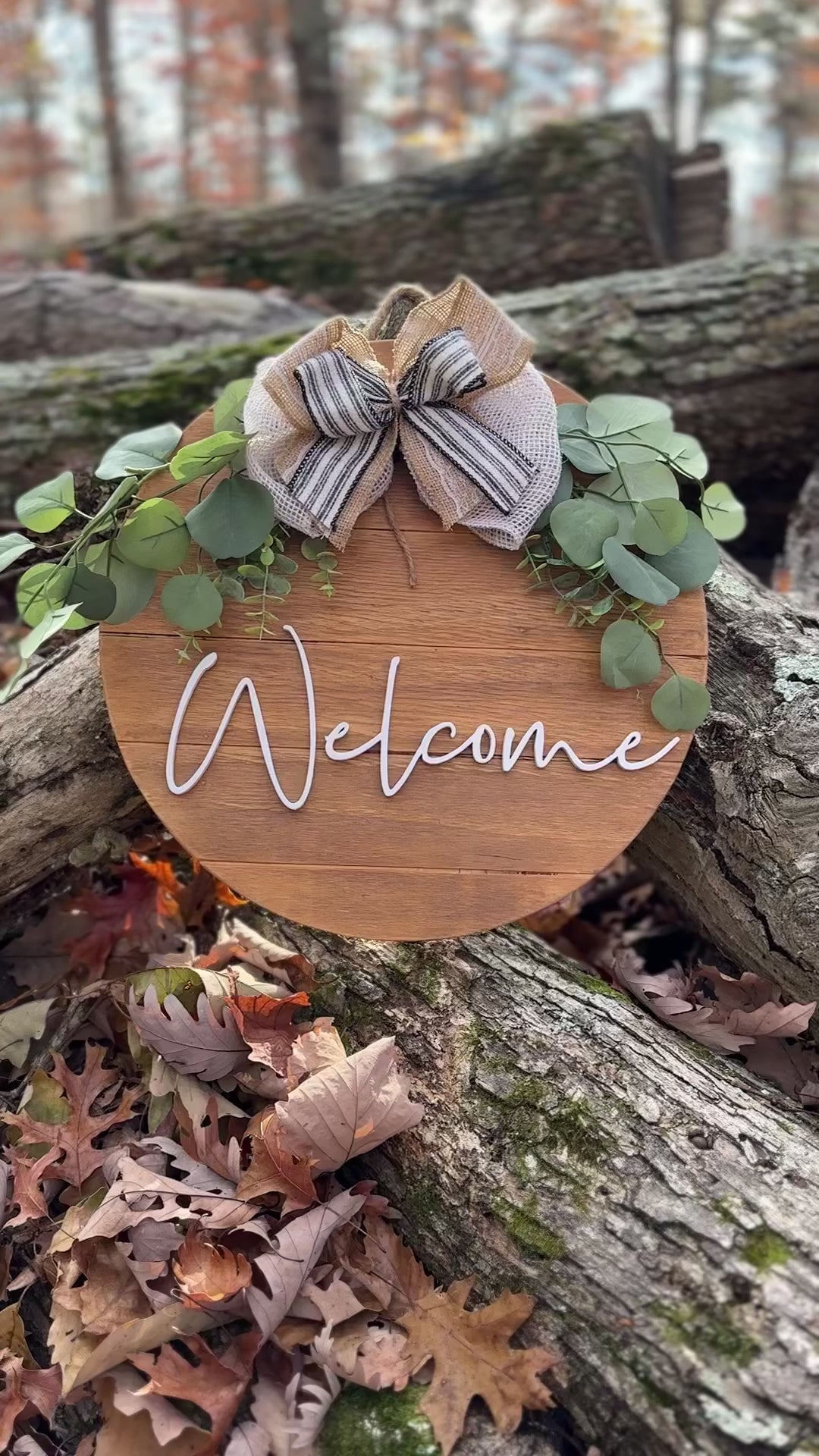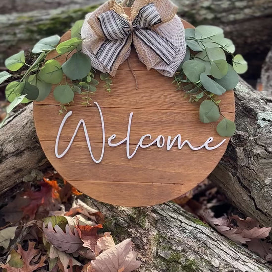 This beautiful Welcome sign looks great on a covered front door, porch or anywhere in your home. :) This piece is completely hand cut and painted along with a beautiful handmade bow. Includes eucalyptus greenery and rope hanger on top for a beautiful display.